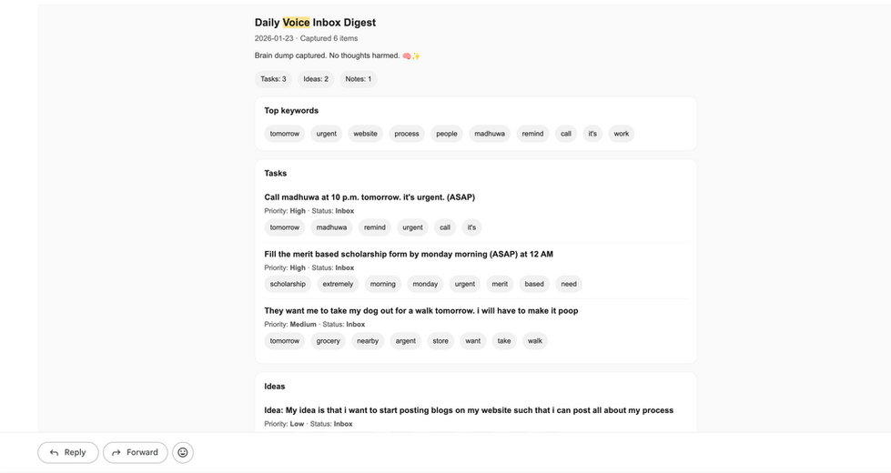 The device lives on the bedside table and uses a simple physical interaction: press a button, speak your thought, press again, and hear a confirmation beep. The captured audio is transcribed locally using offline speech-to-text, intelligently interpreted to infer intent, urgency, and structure, and then automatically organised into a Notion database as an idea, task, or note.